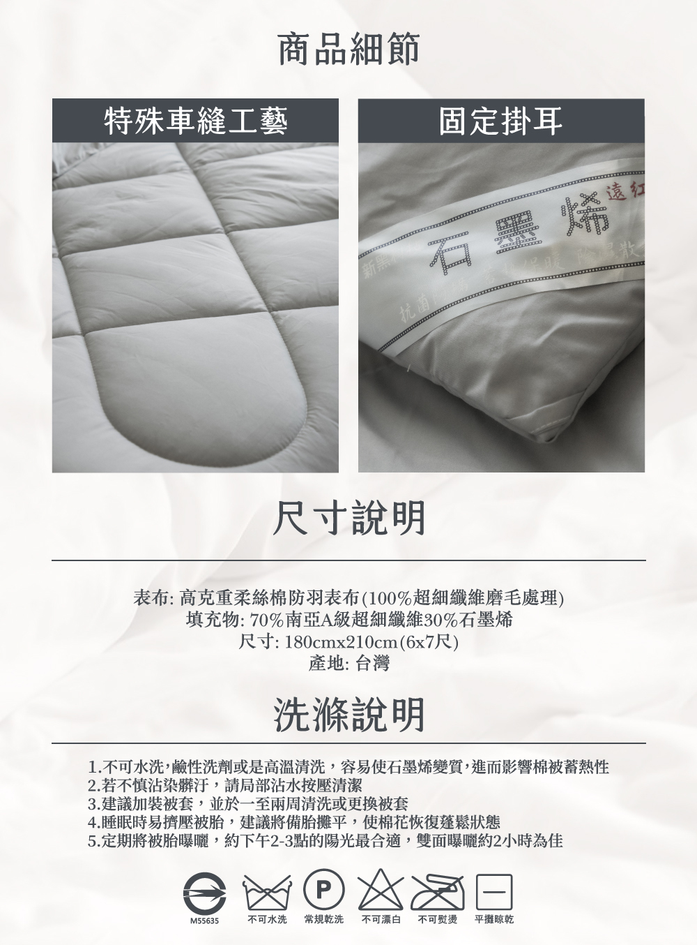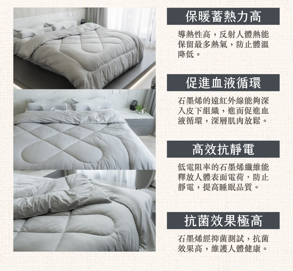 ▸高效抗靜電,石墨烯本身有抗靜電性,若被子帶有靜電容易吸附灰塵及細菌,過多的靜電容易影響中樞神經造成失眠