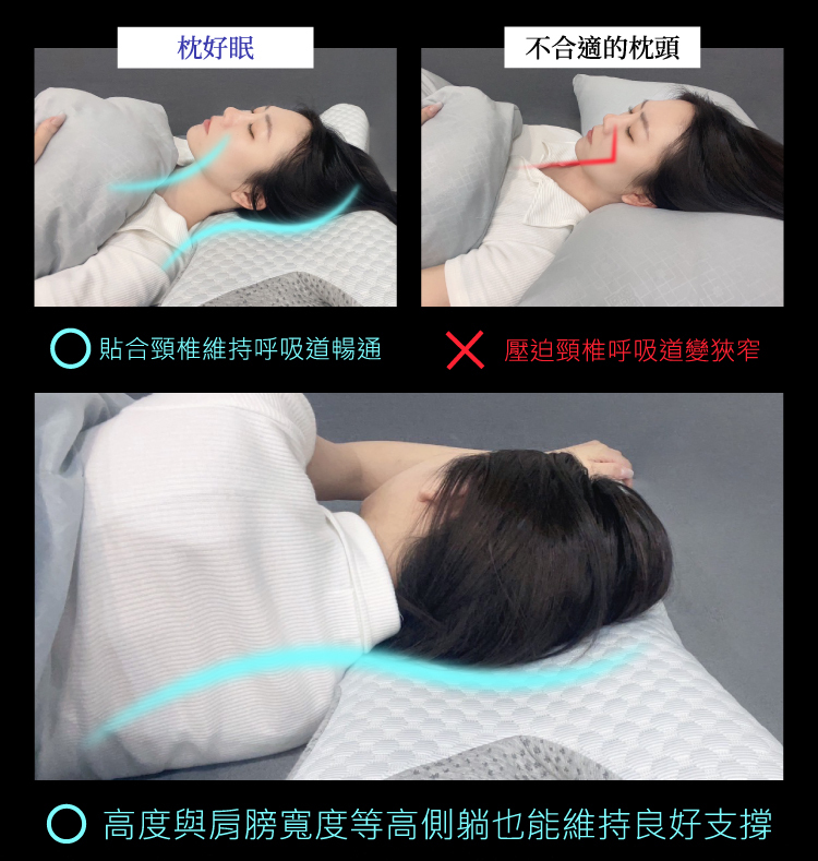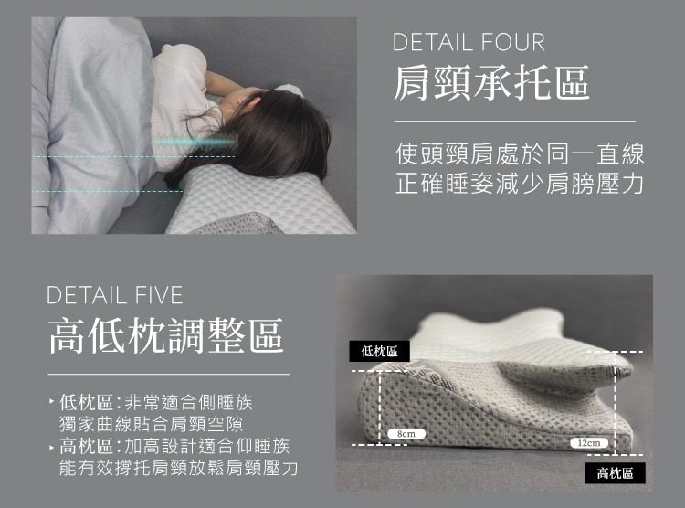 (3)側睡斜面區:高低弧度曲線設計,貼合側面輪廓避免壓迫