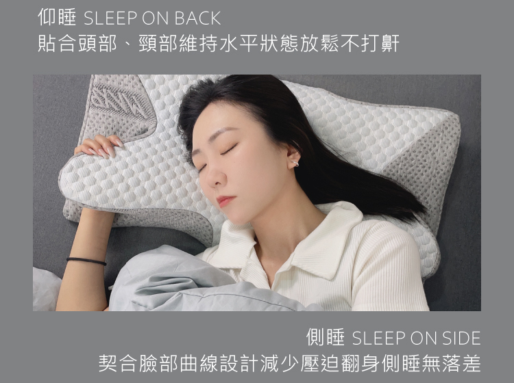 (1)頭部支撐區:枕頭採弧形設計,3D立體包覆頭部放鬆頭夾肌+頸夾肌緩解肌肉壓力
