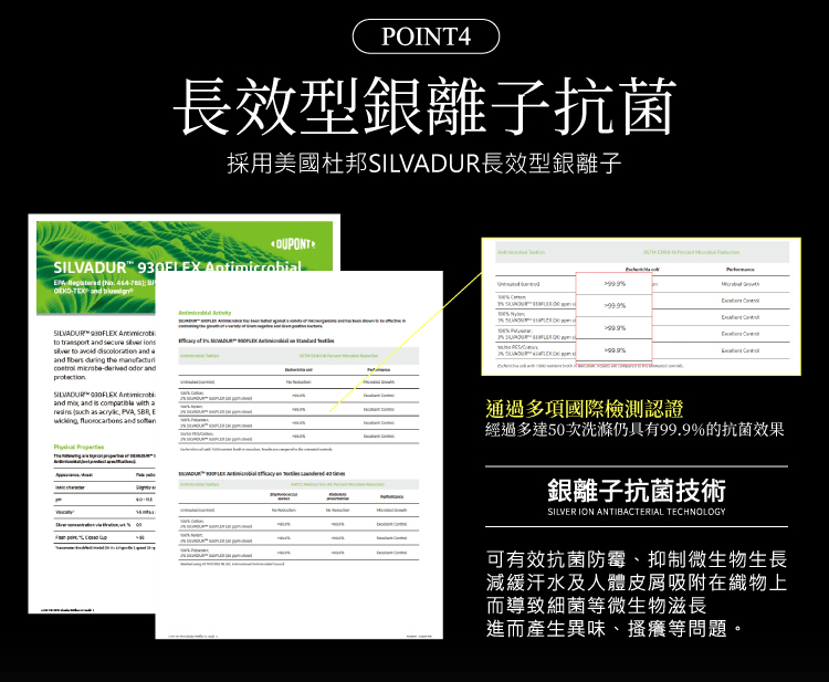(3)長效型銀離子抗菌,採用美國杜邦SILVADUR長效型銀離子,抗菌防黴抑制微生物生長,減
