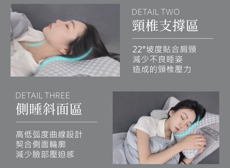 (2)頸椎支撐區:22度坡型貼合肩頸,貼合頸椎避免落枕或是不良睡姿導致的頸椎壓力