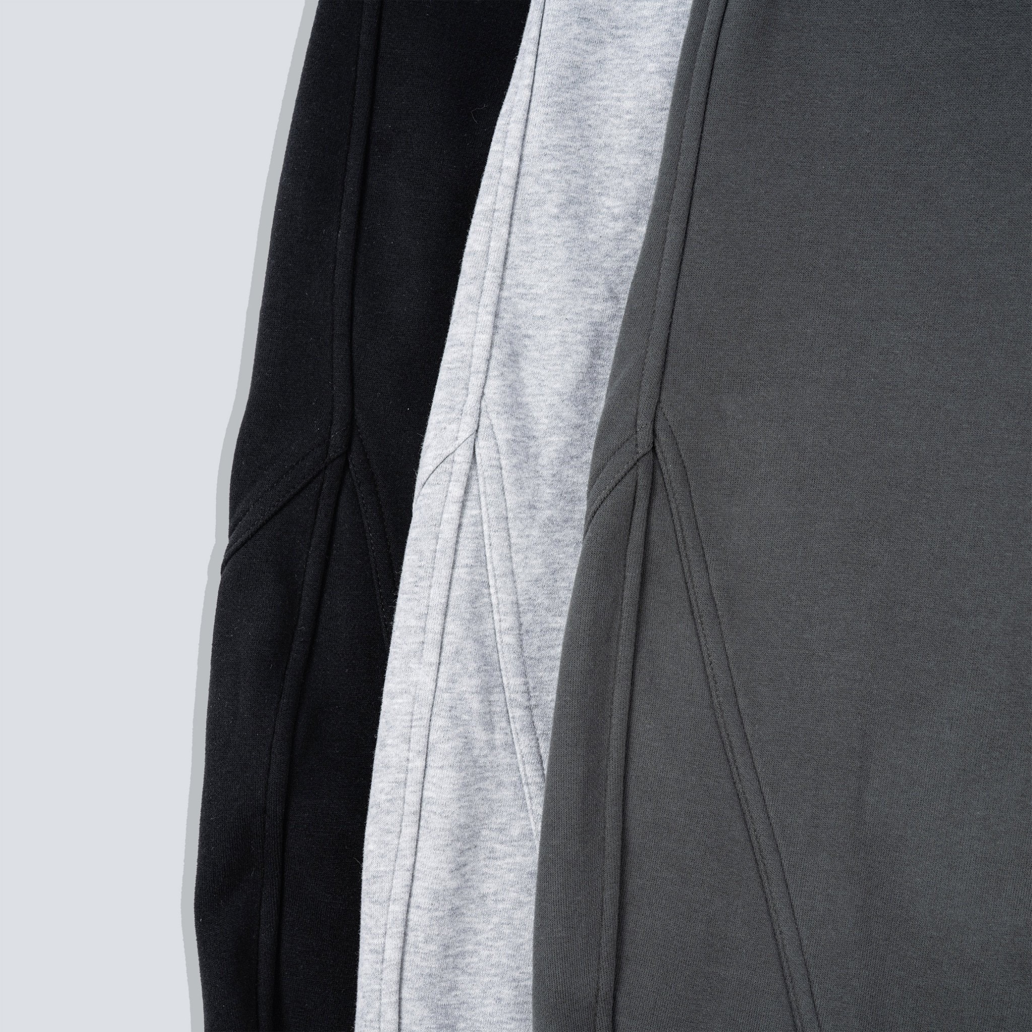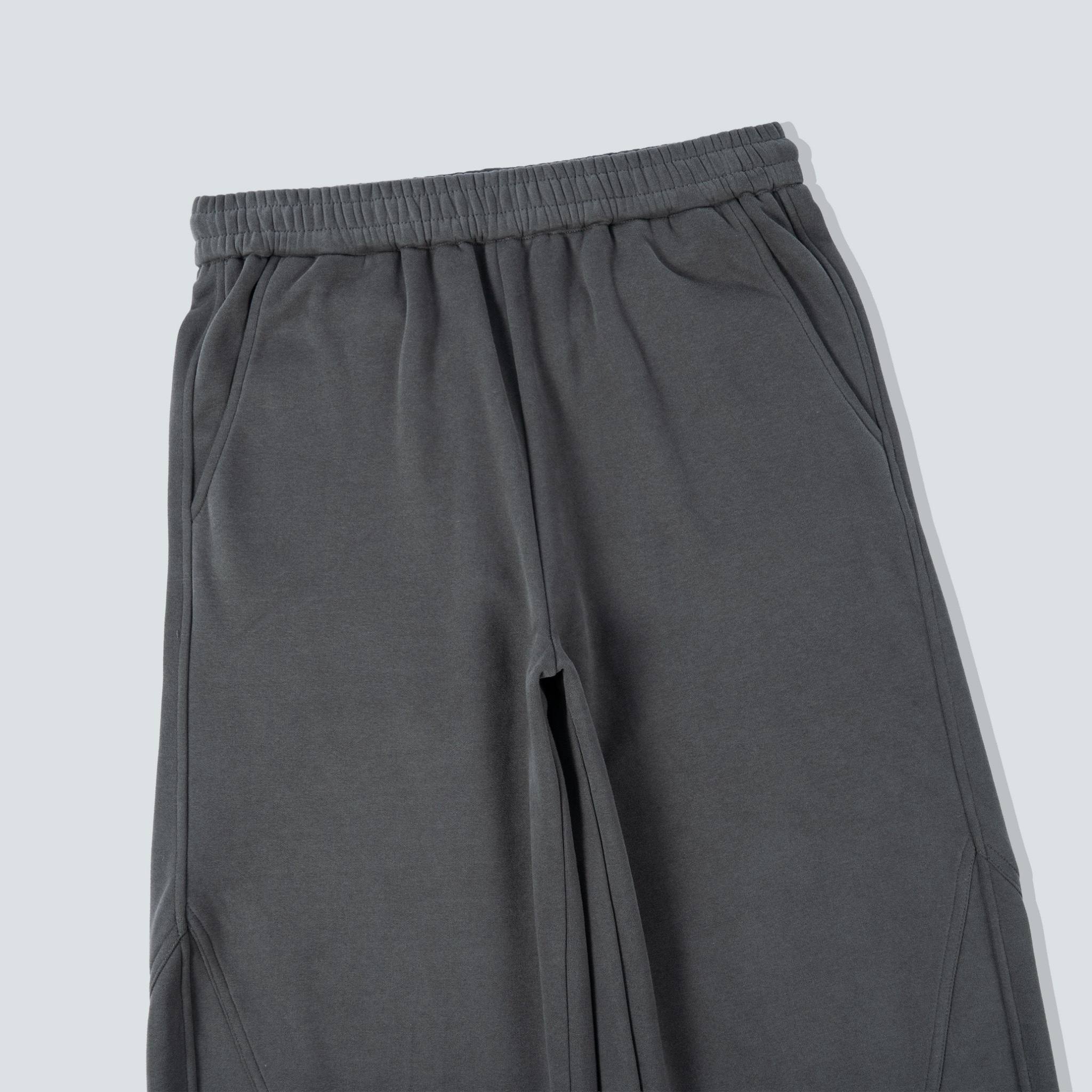 前後在膝蓋處做雙針分拆車縫,圓弧延伸到內側接近褲腳